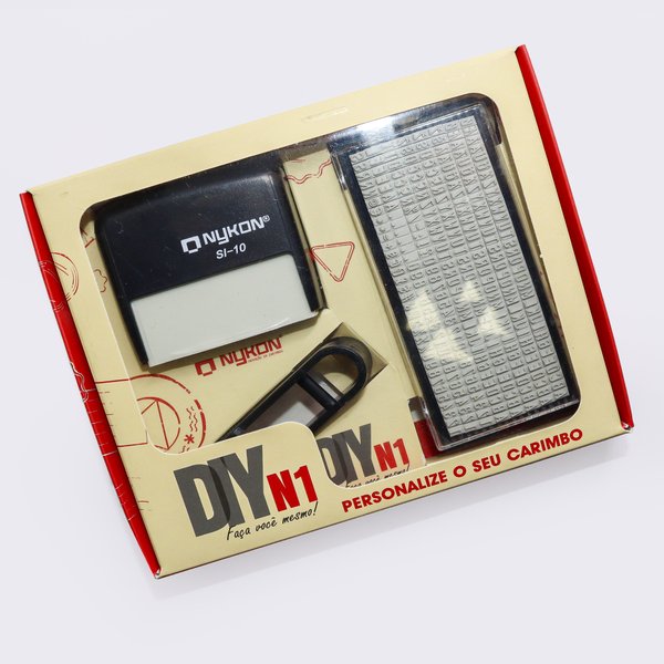 Com o carimbo Faça Você Mesmo da Nykon você mesmo pode montar seu carimbo com o texto que desejar. O Produto acompanha conjuntos de 4 linhas de textos, onde você pode destacar e montar a sua resina. Acompanha ainda uma pinça para ajudar no processo de montagem. Carimbo auto entintado. Disponível na cor preta.